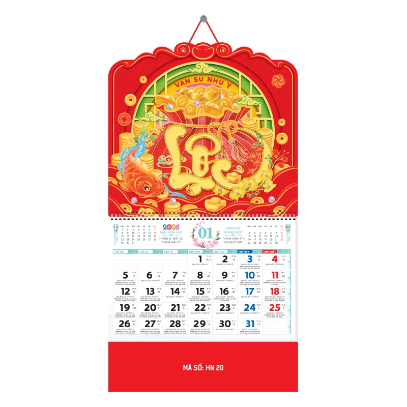 Lịch lò xo giữa gắn bộ số là sản phẩm được thiết kế 12 tờ lịch tương ứng với 12 tháng trong năm. Trên mỗi tờ lịch cung cấp đầy đủ các thông tin thời gian ngày tháng năm dương lịch và âm lịch. Kích thước: 37cm x 68cm là kích thước khá lớn nên mẫu lịch phù hợp để treo trong những không gian rộng như phòng khách, phòng làm việc…